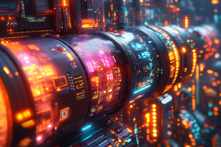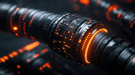 Captivating futuristic abstract technology background featuring illuminated cylindrical structures. The dim ambiance enhances vibrant glowing patterns, showcasing intricate designs and textures, ideal for modern digital applications.