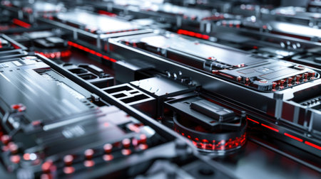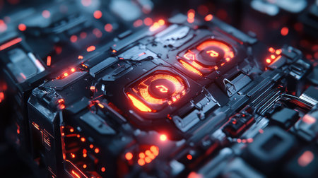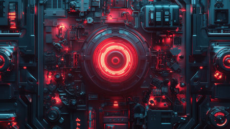 This image showcases a close-up view of a futuristic circuit board with intricate details. The vibrant red and black colors, combined with neon elements, highlight advanced technology and innovation.