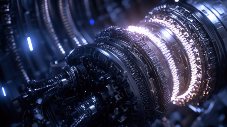A stunning futuristic 3D engine featuring intricate rotating parts and vibrant neon lighting, perfect for technology and sci-fi themes in digital design.