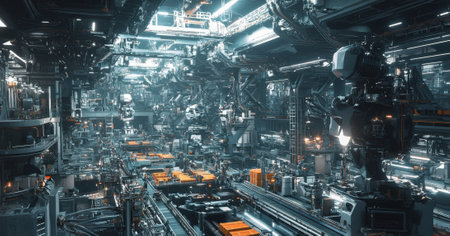 Robotic arms working in automated factory corridor symmetrical layout futuristic design