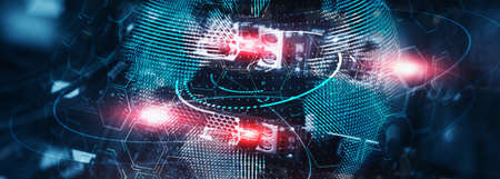 Abstract futuristic backdrop of communication technology for internet business. Global world network and telecommunication on earth, blockchain. Copy ad text space. Generative cartoon Ai illustration
