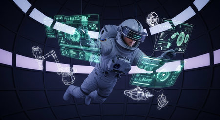 an astronaut uses holographic displays in a futuristic space station, a vision of future technology