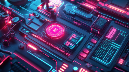An immersive futuristic digital control panel featuring vibrant neon elements and intricate interfaces, ideal for sci-fi art, technology concepts, and modern design projects.