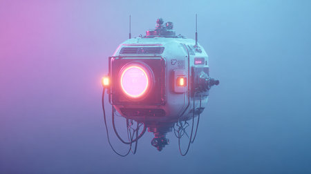 Robot, Learning Pod, High-Tech, Set in a space station, Holographic projections, 3D render, Spotlight, Depth of field bokeh effect
