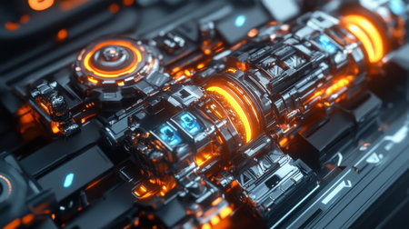Close-up of a futuristic technological device with vibrant orange and blue illumination.