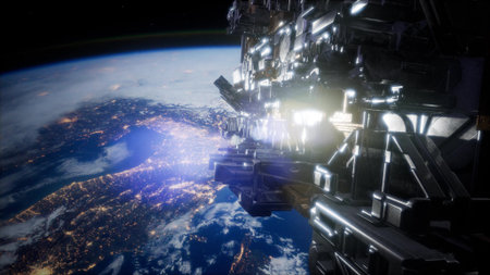 Bright lights illuminate a city on Earth as a futuristic satellite hovers above the planet. The scene showcases the beauty of our world from a unique vantage point against the cosmos.