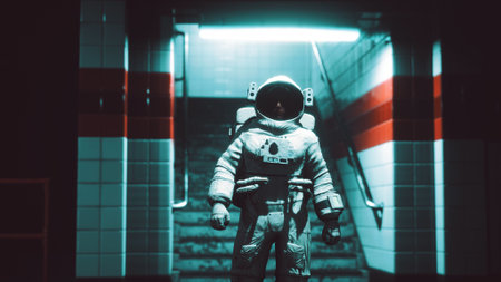 An astronaut stands in a dimly lit underground subway station illuminated by neon lights. The scene captures a blend of science fiction and urban life as the figure prepares for an adventure.
