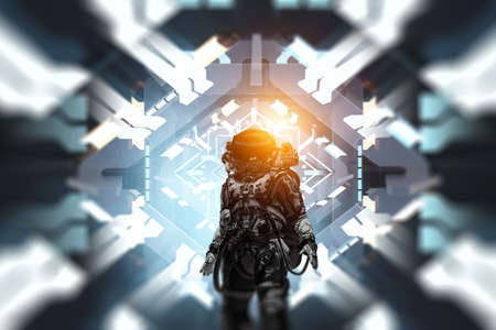 Astronaut walking in spaceship tunnel, sci-fi shuttle corridor. Futuristic abstract technology. Technology and future concept. Flashing light. 3d illustration
