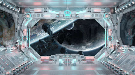 White spaceship interior with glowing blue and red lights. Futuristic spacecraft with large window view on planets in space and control panels. 3D rendering