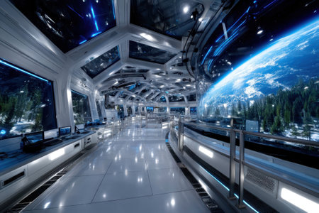 A sleek, modern space station interior showcases stunning views of Earth, with high-tech consoles and bright lights.