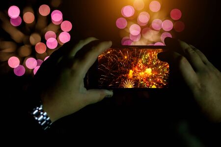 Taking the photo of fireworks via smartphone. Broadcast salute video to the internet