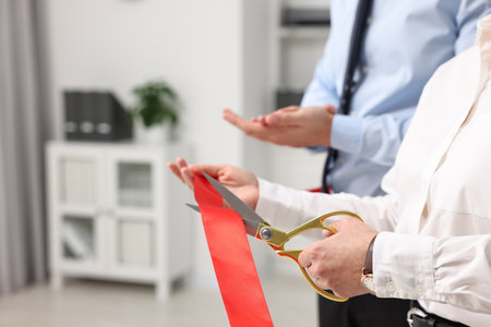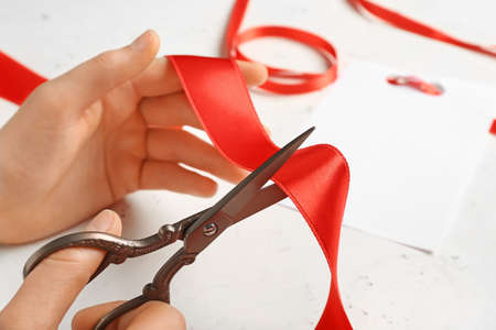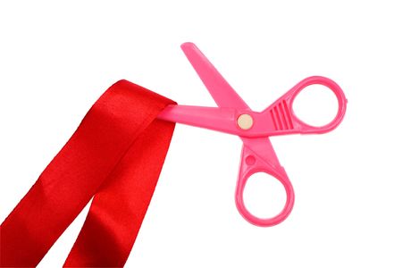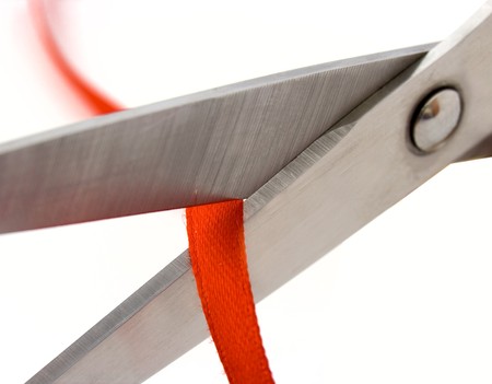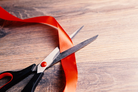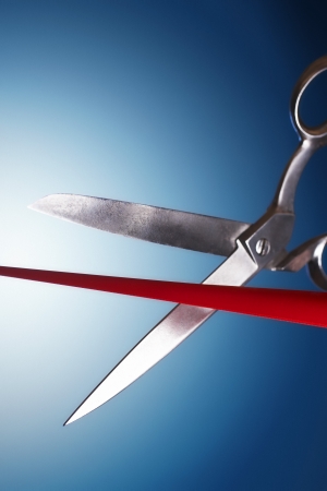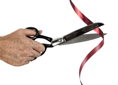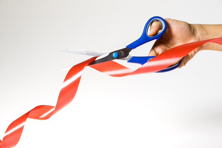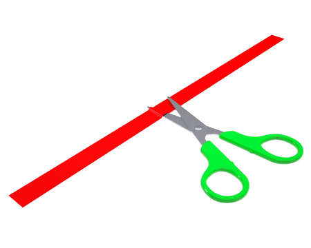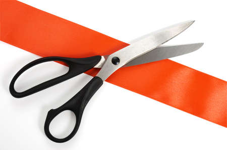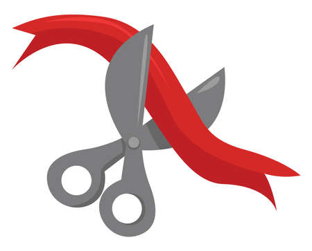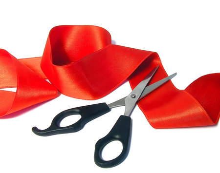 Scissors cutting a red ribbon depicting an inauguration , launch, opening or start of an official ceremony