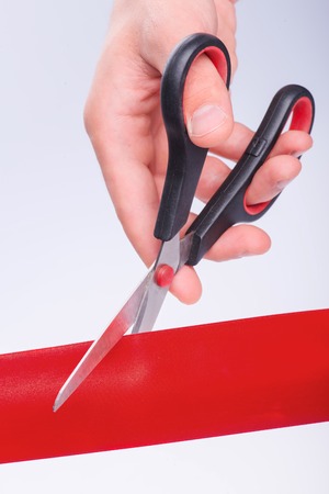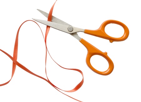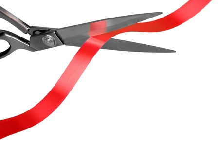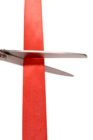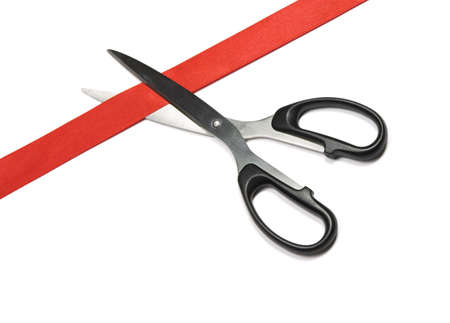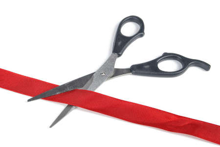 Close-up of scissors cutting red ribbon or tape isolated on a white background