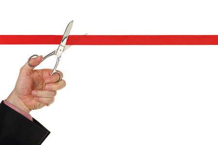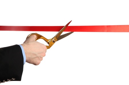Man's hand cutting red ribbon with pair of scissors isolated on white