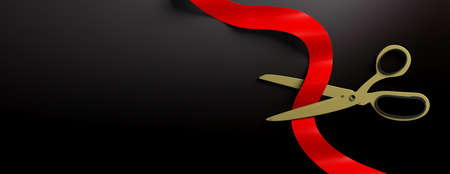 Grand opening concept. Gold scissors cutting red silk ribbon against black background, banner. 3d illustration