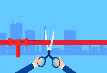 Grand Opening Hand With Scissors Cut Red Ribbon Bow Modern Big City Background Flat Vector Illustration