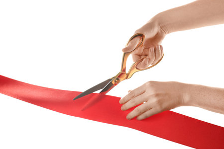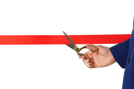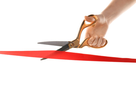 Grand opening, ribbon cut, Gold scissors cutting red satin ribbon isolated on white background. Inaugural invitation, business launch concept, copy space