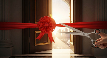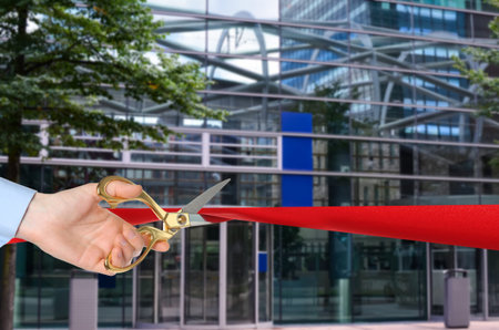 Grand Opening illustrated with a scissors, a red ribbon and confetti on a white background