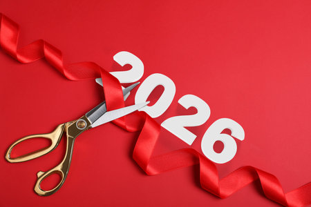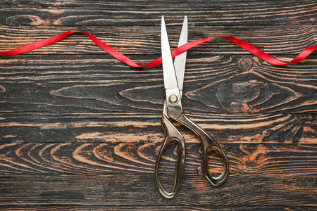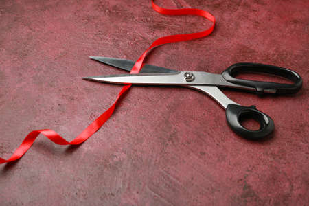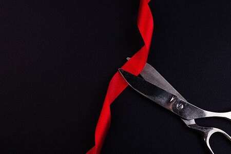 Grand opening. Top view of gold scissors cutting red silk ribbon against black background, banner, copy space.