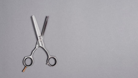 Scissors and space for text on gray background, top view. hair dresser tool