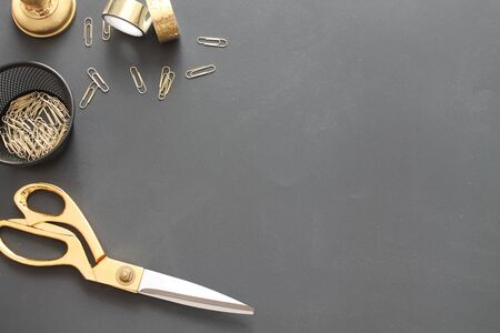 Scissors gold color set on black background, Tailor, barber, hairdresser luxury equipment, top view