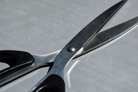 Metal scissors with black plastic handle. Close-up view of metal scissors with black plastic handle on gray background.