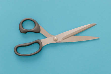 Flat lay of scissors isolated on blue background, top view photography