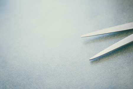 Professional hairdresser scissors on gray background. Shallow depth of field. Toned.