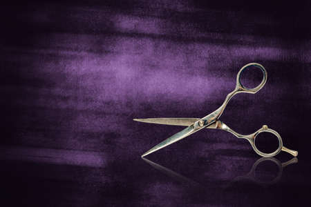 Vintage, old, hairdressing scissors, on shabby purple background. Barbershop background. Reflection. Copy spaceBeauty and fashion