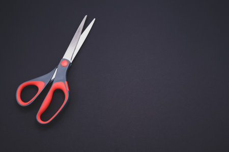 Large tailors scissors with a plastic handle on a dark background. Close-up. Space for lettering and design
