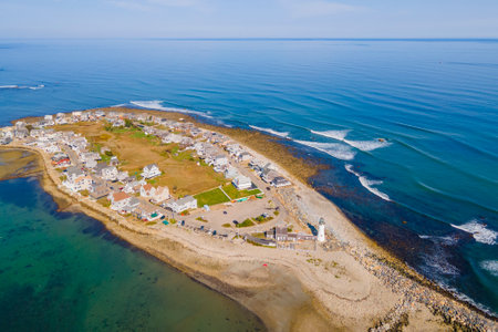 Old Scituate Lighthouse aerial view at Cedar Point at the entrance of Scituate Harbor, town of Scituate, Massachusetts MA, USA.