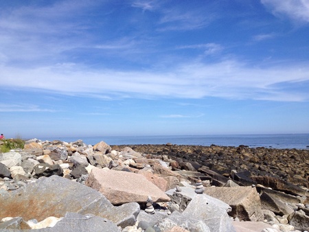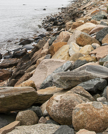 Large rocks protecting the shore of Narragansett Rhode Island seperating the water from the land.