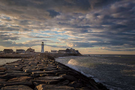 Scituate Harbor lighthouse overlooks a breakwater in Massachusetts - Oct, 2022. High quality photo