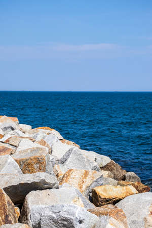 A rocky breakwater overlooking the gulf of Gdansk near the beach at Westerplatte at sunset. Gdansk, Poland