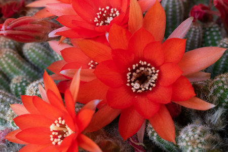Vibrant red flowers on cactus close up, flowering cactus in summer