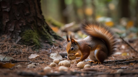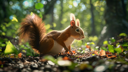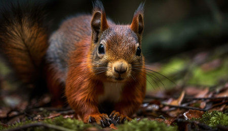 A captivating close-up of a vibrant red squirrel amidst the forest floor. Its captivating gaze and rich fur are beautifully captured.