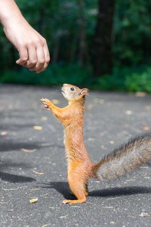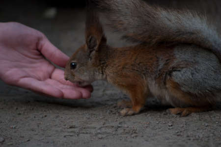 Hand with nut and squirrel. Man feeds a squirrel.