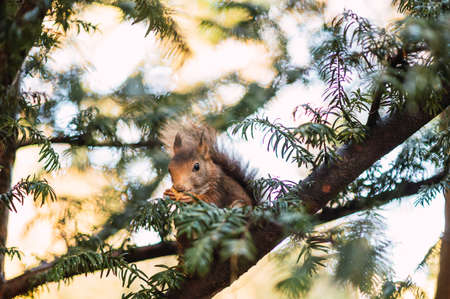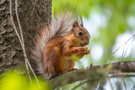 The squirrel with nut sits on a branches in the spring or summer. Eurasian red squirrel, Sciurus vulgaris