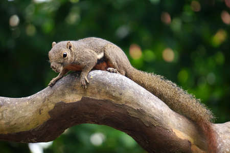 Squirrel sitting on a tree branch in a forest, close up