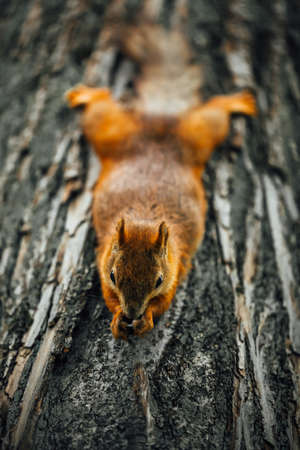 Squirrel sits on a tree and looks at the camera. Close-up.