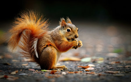 A charming squirrel poses adorably in the street, perfectly blending nature with urban life. Its curious expression and fluffy fur capture the essence of wildlife.