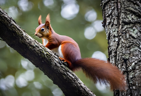 Red squirrel on a tree, with a beautiful bokeh in the background. Low depth of sharpness