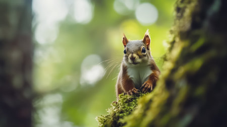 Curious red squirrel perched on a mossy tree branch observing its surroundings in a dense forest filled with greenery and natural light. This charming sight captures the essence of wildlife.