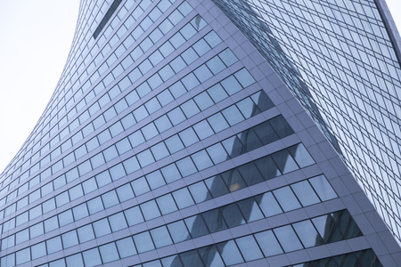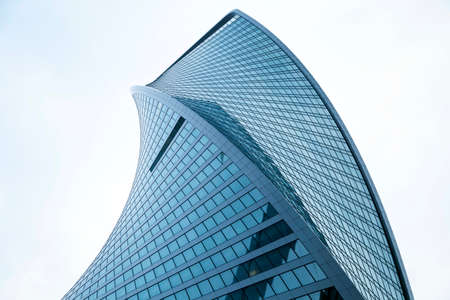 Moscow, Russia - April 13, 2021: Bottom view of the facade of a modern glass building with reflections and sky. Urban geometry, modern architecture, abstract architectural design