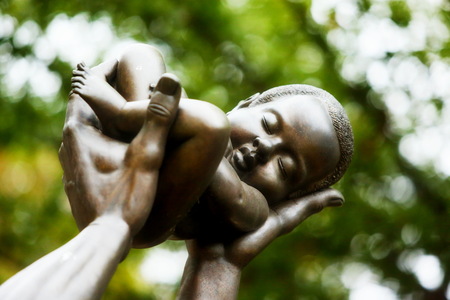 A white vintage little girl ceramic sculpture in the garden, selective focus.