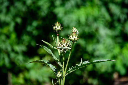 Blooming Thistle or Carduus flower buds on stem macro with bokeh background, selective focus, shallow DOF.