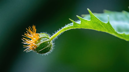 A green, round, spiky flower bud with leaves on a yellow background.