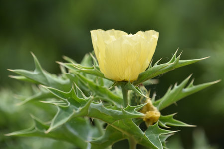 Closeup of Satyanashi , the Mexican prickly poppy plant with yellow flowers