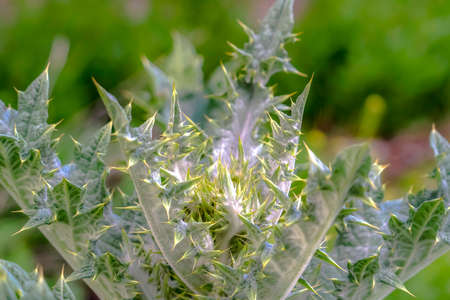 Close up detail with a Thistle plant with sharp prickles. Plant from the family Asteraceae.