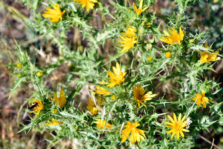Macro photography of blooming common golden thistle, or Scolymus hispanicus flowers